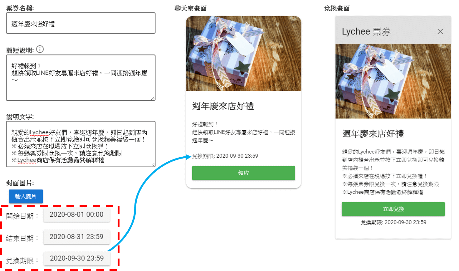 - 結束時間:超過此時間好友就無法再領取該票券