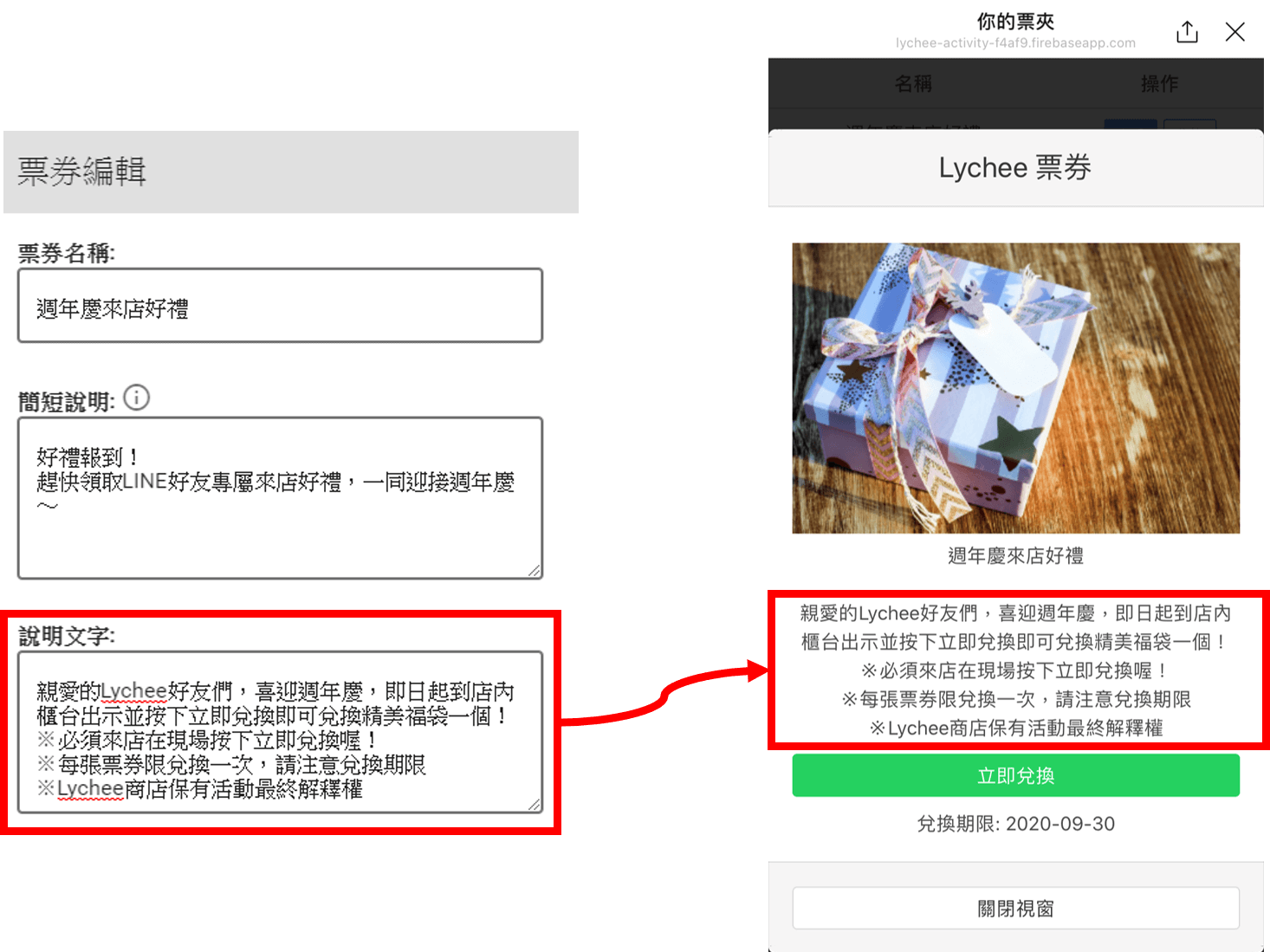 說明文字是在好友領取票券後,在票匣中查看票券時會看到的詳細票券說明文字。