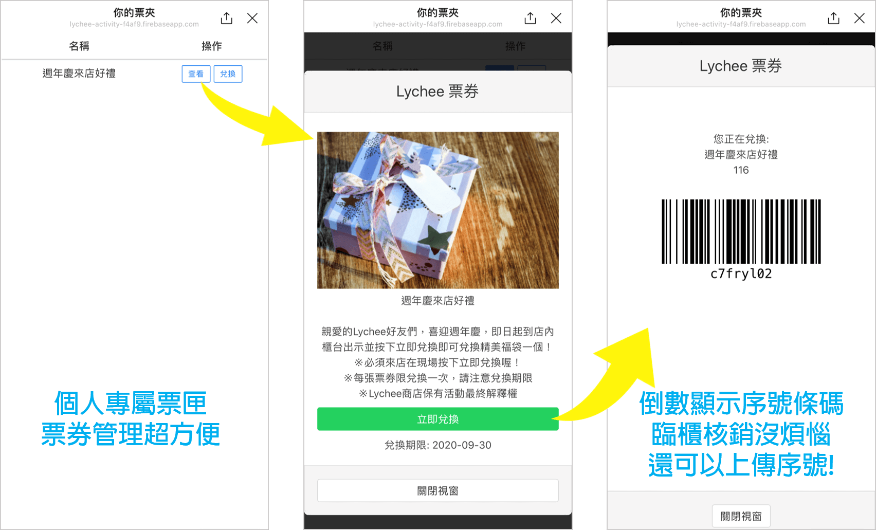 - 兌換時間:過了此時間之後就無法再兌換該票券(此時間會顯示在票券中)