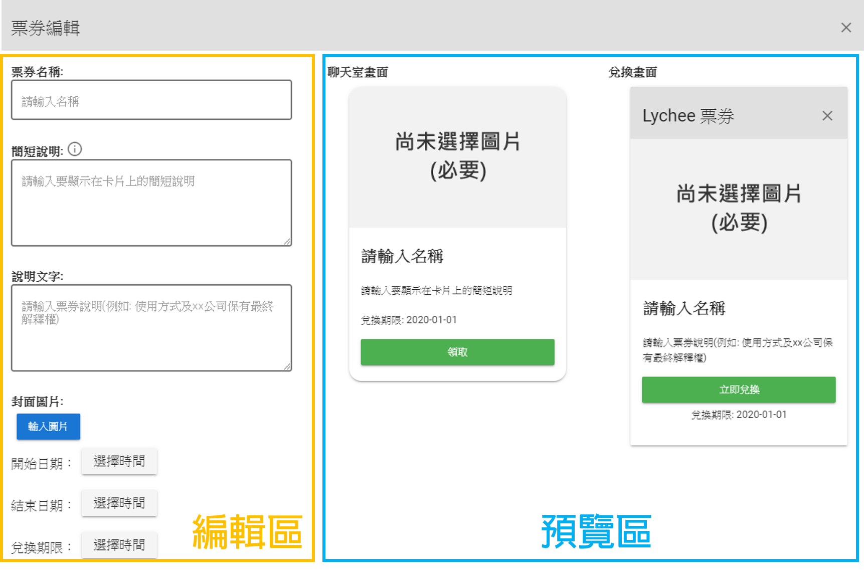 從左側的功能列中的內容管理進入票券模組頁面,按「新增票券」選擇票券序號的類型後,進入票券新增視窗,視窗分為左側編輯區和右側預覽區。