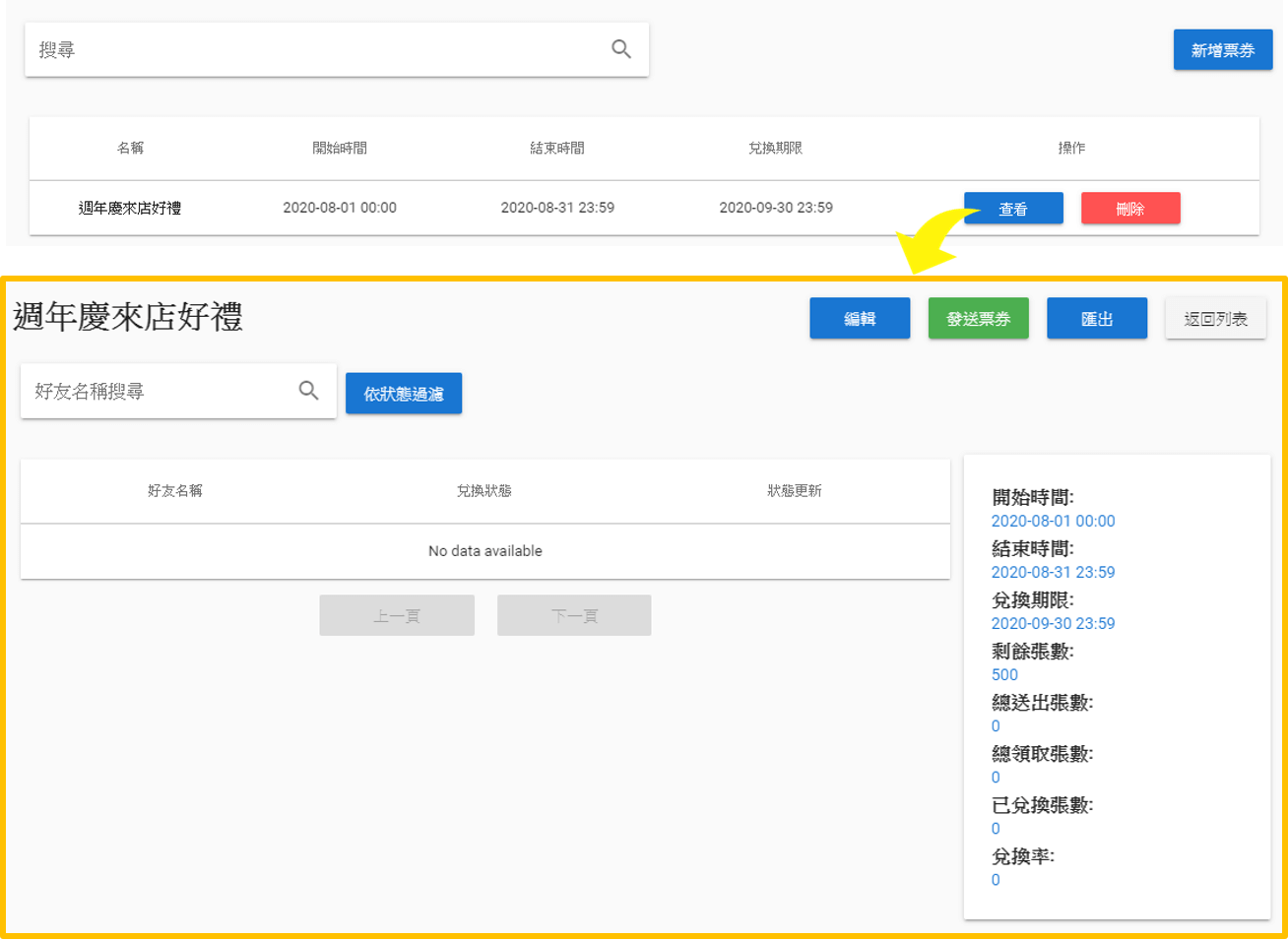 設定好上述的項目並成功儲存後,您可以在票券模組頁面按「查看」可以進入該票券的頁面查看數據。